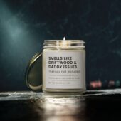 Funny Therapy Joke Candle | Edgy ‘Driftwood and Daddy Issues’ Scent | Sarcastic Self-Care Gift