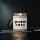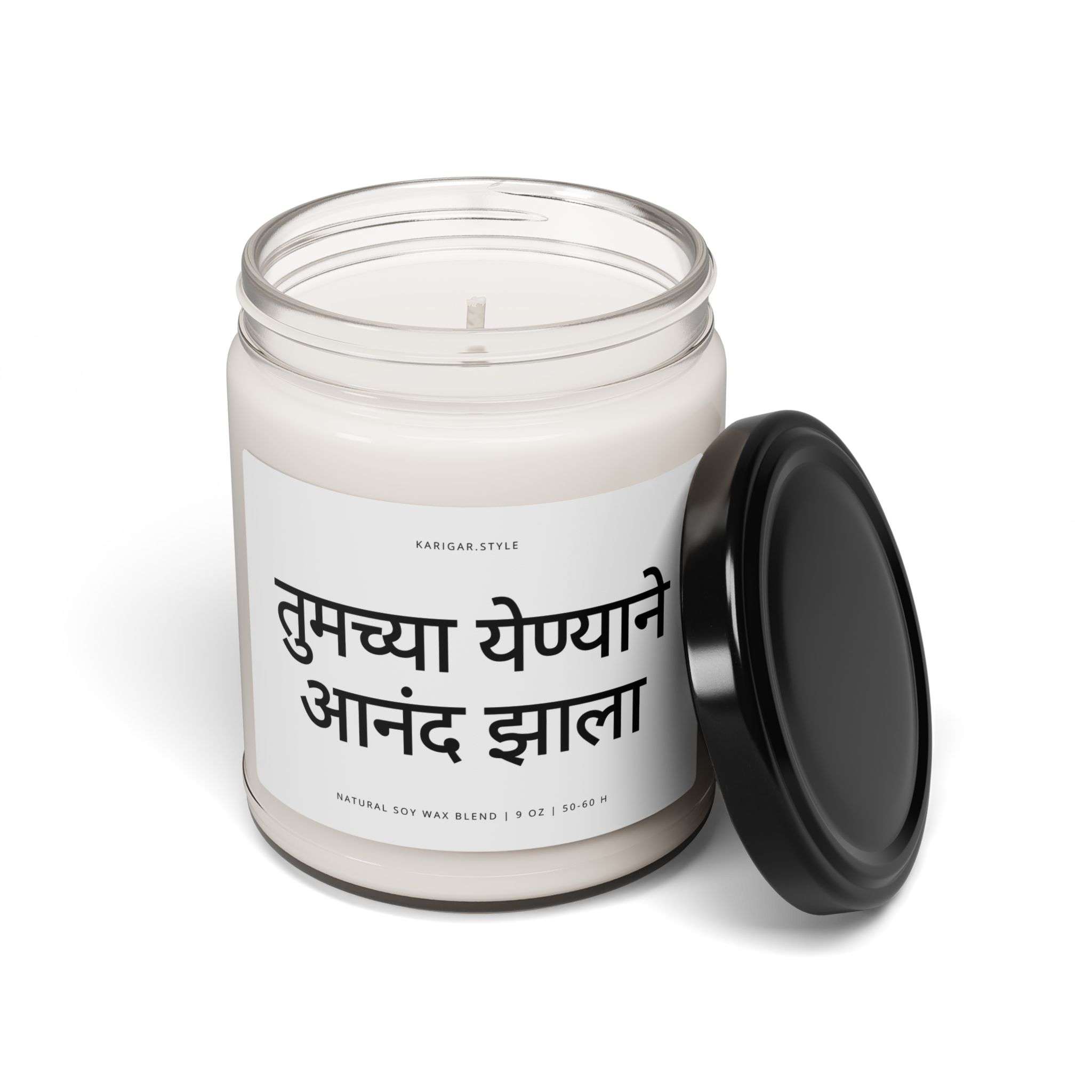 Express your genuine happiness and gratitude with this elegant scented candle. It features the warm Marathi phrase, “तुमच्या येण्याने आनंद झाला” (Your arrival has brought happiness), the perfect way to show a guest how much their presence means. The beautiful candle pattern marathi script makes it a stunning addition to your marathi home design, creating an atmosphere of warmth and sincere appreciation.