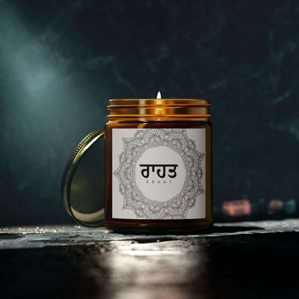 Find soothing ‘Rahat’ (Relief and Comfort) with this exquisite scented candle, designed to bring a sense of ease and tranquility to your Punjabi home. Featuring the calming Gurmukhi word ‘ਰਾਹਤ’ (Rahat) nestled within an elegant mandala design, it’s a beautiful reminder to pause, breathe, and find comfort in the present moment.