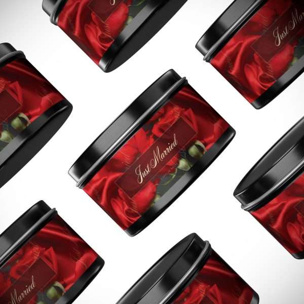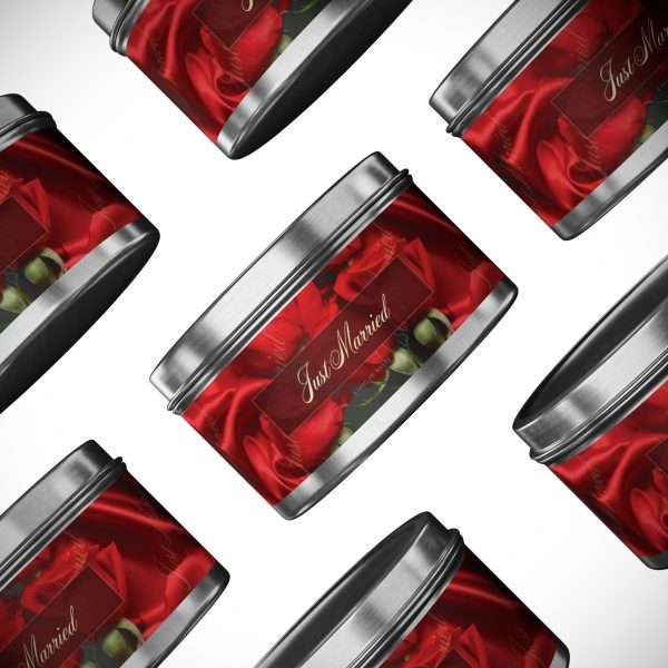 Celebrate the happy couple with our beautiful ‘Just Married’ scented candle, the perfect romantic gift for newlyweds embarking on their new life together. Featuring elegant “Just Married” script against a backdrop of lush red roses, this scented tin candle sets a loving and celebratory mood, ideal for commemorating their special union.