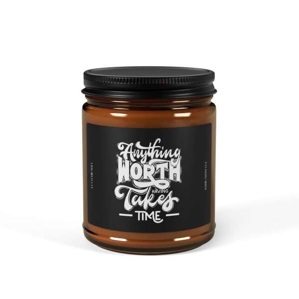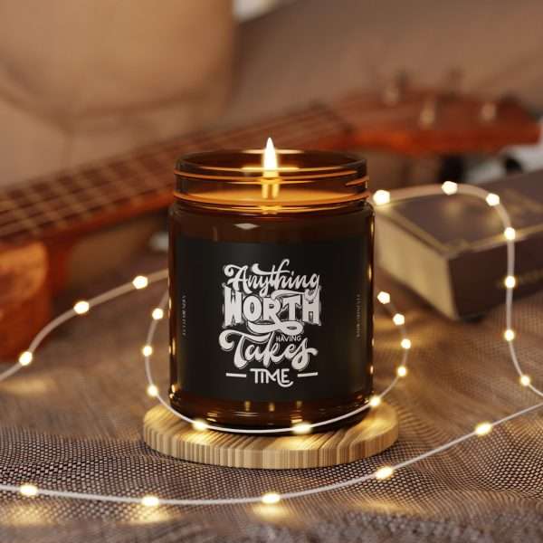 Here’s a lovely way to add a thoughtful touch to any room! Our Scented Soy Candle, glowing warmly from its amber jar, features the uplifting message: “Anything WORTH HAVING Takes TIME.” It’s a simple, beautiful reminder that makes for a wonderful eco-friendly soy gift or a special treat for yourself.