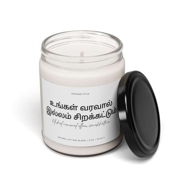 Offer the most gracious and heartfelt welcome with this exquisite scented candle. It features the beautiful Tamil blessing, “உங்கள் வரவால் இல்லம் சிறக்கட்டும்” (Uṅkal varavāl illam siṟakkaṭṭum), which means “May your presence grace this home.” This is a stunning piece of tamil house decor, designed to honor your guests and fill your space with warmth, respect, and a beautiful fragrance.