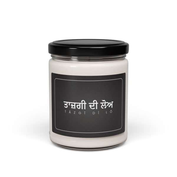 Ignite renewal with the Tāzgī dī Ló Gurmukhi script candle for positivity! This beautifully crafted soy candle brings a revitalizing Jot (light) and the Punjabi Tāzgī theme meaning freshness into your personal Asthān (dwelling), inspiring Navāpan (newness) and upliftment.