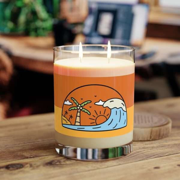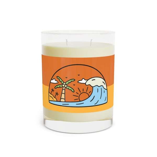 Escape to paradise with our vibrant Tropical Sunset Scented Soy Candle. Featuring a cheerful beach scene design wrapping around the 11oz clear glass jar, this candle instantly brings relaxing vacation vibes and a splash of color to your home decor. Perfect for unwinding or creating an inviting, relaxing ambiance.
